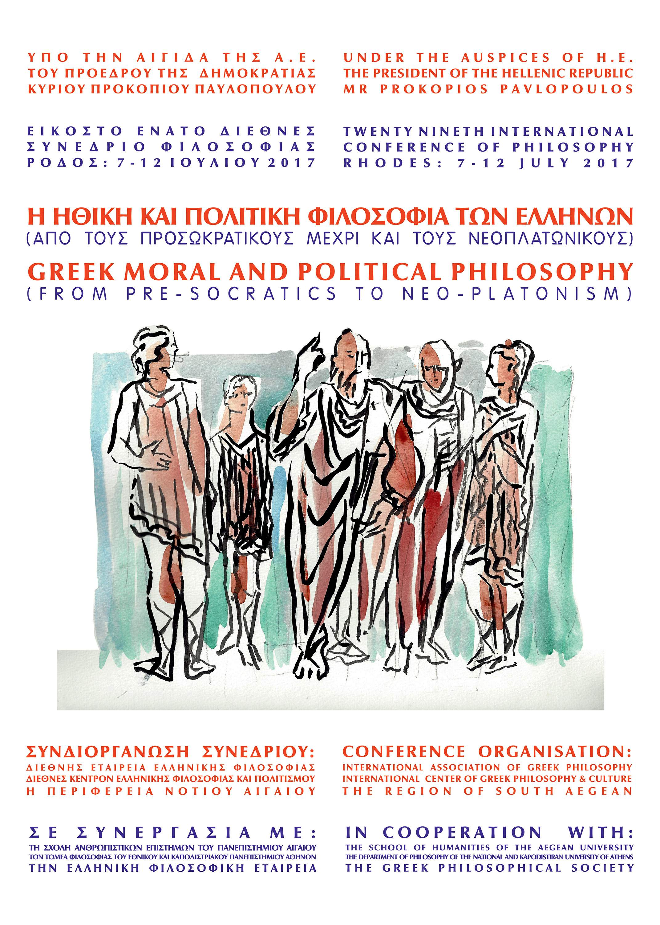 Αξιότιμοι κύριοι και κυρίες, Η Διεθνής Εταιρεία Ελληνικής Φιλοσοφίας, η Ελληνική Φιλοσοφική Εταιρεία και άλλες Επιστημονικές Ενώσεις, Εταιρείες και Εκπαιδευτικά Ιδρύματα (Τομἐας Φιλοσοφἰας του ΕΚΠΑ,η Σχολή των Ανθρωπιστικών Επιστημών του Πανεπιστημίου Αιγαίου), σας ανακοινώνουν ότι από την 7-12 Ιουλίου του 2017 θα διεξαχθεί το: 29οΔΙΕΘΝΕΣ ΣΥΝΕΔΡΙΟ ΦΙΛΟΣΟΦΙΑΣ με θέμα: H ΗΘΙΚΗ ΚΑΙ ΠΟΛΙΤΙΚΗ ΦΙΛΟΣΟΦΙΑ ΤΩΝ ΕΛΛΗΝΩΝ (ΑΠΟ ΤΟΥΣ ΠΡΟΣΩΚΡΑΤΙΚΟΥΣ ΜΕΧΡΙ ΚΑΙ ΤΟΥΣ ΝΕΟΠΛΑΤΩΝΙΚΟΥΣ).