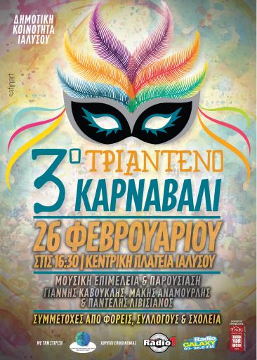 3ο ΤΡΙΑΝΤΕΝΟ ΚΑΡΝΑΒΑΛΙ 2017 - ΠΡΟΣΚΛΗΣΗ -Σας προσκαλούμε να τιμήσετε με την παρουσία σας της αποκριάτικες εκδηλώσεις που διοργανώνονται από τη Δημοτική Κοινότητα Ιαλυσού με τη στήριξη του Δημοτικού Οργανισμού Πολιτισμού –Αθλητισμού Ρόδου (Δ.Ο.Π.Α.Ρ)στο πλαίσιο εορτασμού για το 3ο ΤΡΙΑΝΤΕΝΟ ΚΑΡΝΑΒΑΛΙ που θα πραγματοποιηθεί τη Κυριακή 26 Φεβρουαρίου 2017 και ώρα 16.30 στην κεντρική πλατεία Ιαλυσού.