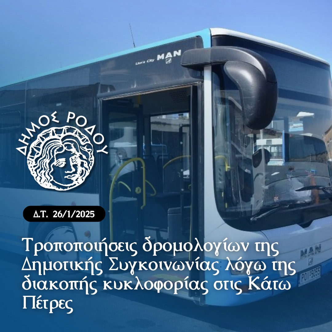 Ο Δήμος Ρόδου ενημερώνει τους επιβάτες της Δημοτικής Συγκοινωνίας ότι, λόγω της διακοπής κυκλοφορίας στην Επαρχιακή Οδό Ρόδου-Καμείρου από το 1ο χιλιόμετρο (συμβολή με οδό Παπαλουκά) έως το 2ο χιλιόμετρο (περιοχή Κάτω Πέτρες) και στα δύο ρεύματα κυκλοφορίας, που είναι σε ισχύ από τις 06:00 το πρωί σήμερα Κυριακή 26 Ιανουαρίου 2025 έως τις 09:00 το πρωί της Τετάρτης 29 Ιανουαρίου 2025, λόγω ελέγχου και αποκατάστασης στα πρανή του Λόφου Ακρόπολης και της περιοχής Κάτω Πέτρες, τα δρομολόγια των λεωφορείων για το χρονικό διάστημα αυτό διαμορφώνονται ως εξής: