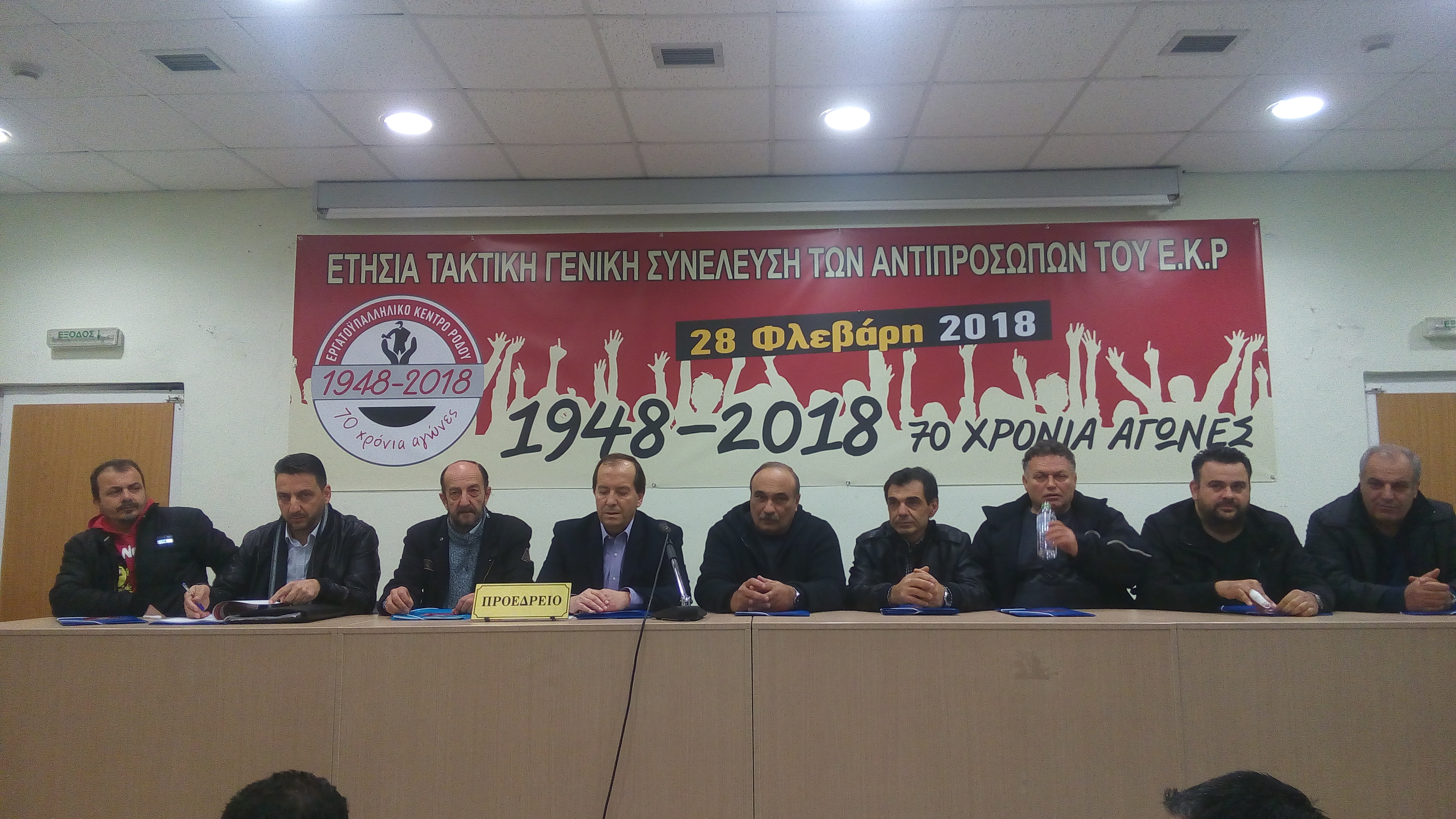 Με ποσοστό 82% υπερψηφίστηκε χθες το βράδυ ο Διοικητικός και ό Οικονομικός απολογισμός καθώς και ο προγραμματισμός της διοίκησης του εργατικού κέντρου Ρόδου που παρουσιάστηκε από τον πρόεδρο του Σάββα χατζησάββα στους 90 συνέδρους που πήραν μέρος στην ετήσια τακτική συνέλευση των αντιπροσώπων. -Ο Σάββας Χατζησάββας στην ομιλία του αναφέρθηκε στα 70 χρόνια δράσης και αγώνα για τα δικαιώματα των εργαζομένων του Εργατικό Κέντρο Ρόδου που εορτάζονται φέτος και τονισε ότι «συνεχίζουμε αταλάντευτα στον δρόμο του αγώνα που χάραξαν οι προηγούμενοι από εμάς». «Το Ε.Κ.Ρ ήταν, είναι και θα είναι εδω-σημείωσε ο κ. Χατζησάββας-για να υπερασπιστεί με αγώνες τα κεκτημένα δεκαετιών και θα παλέψει στους δρόμους και στους χώρους δουλειάς για να ανατρέψει τις πολιτικές της λιτότητας και της φτωχοποίησης».