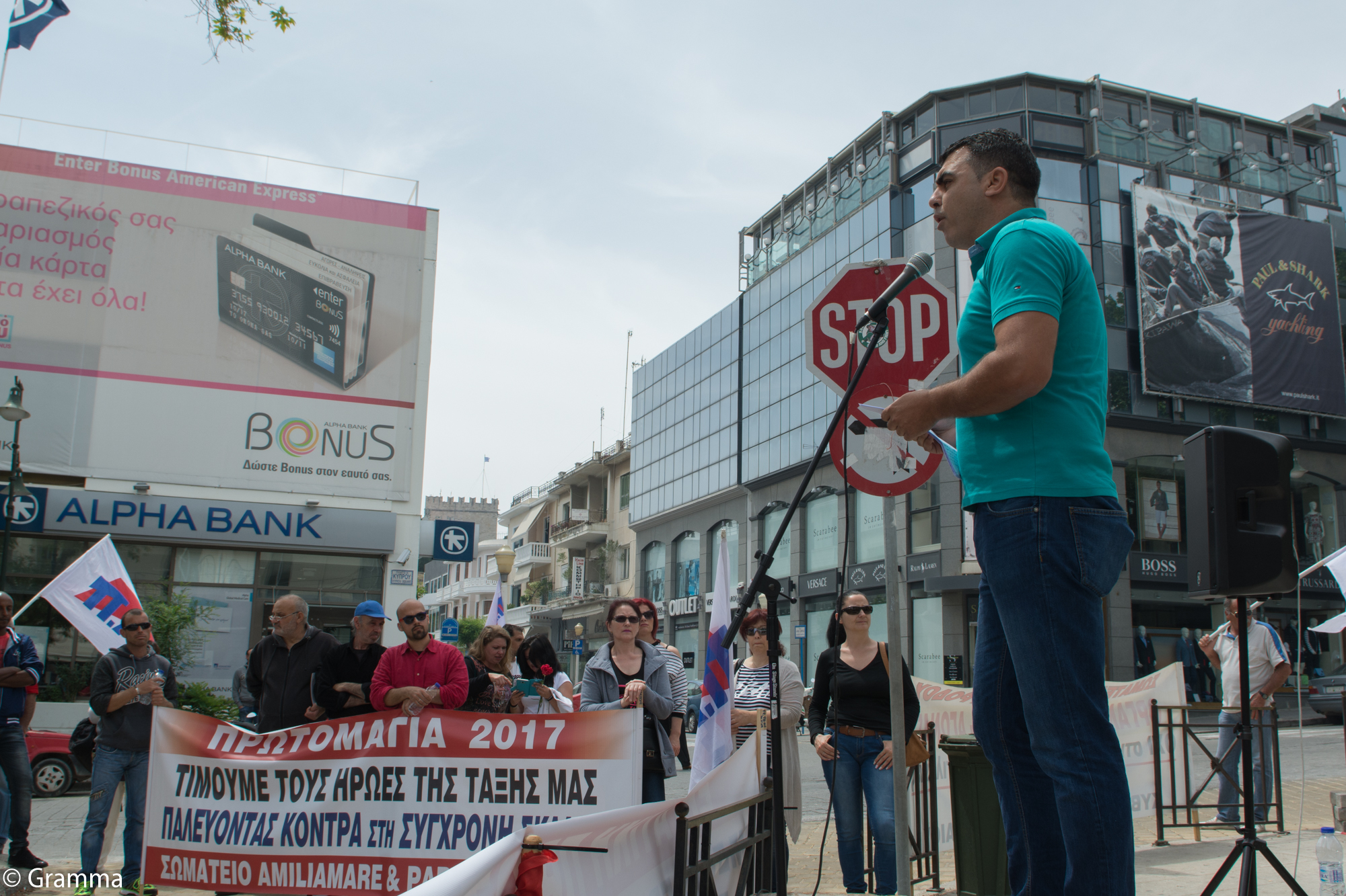 Δελτίο Τύπου-Πραγματοποιήθηκε η Πρωτομαγιάτικη απεργιακή συγκέντρωση των Σωματείων στην πλατεία Κύπρου. Ήταν η κορύφωση μιας μάχης που δόθηκε ιδιαίτερα την τελευταία εβδομάδα. Προηγήθηκαν εκδηλώσεις σε τόπους δουλειάς, προβολές ταινιών, ομιλίες με θέμα την Εργατική Πρωτομαγιά, τους αγώνες των εργαζομένων, τις θυσίες της εργατικής τάξης. Εκδηλώσεις και δράσεις που απλώθηκαν και σε άλλα χωριά όπως στον Αρχάγγελο. Από νωρίς το πρωί η εξέδρα και οι σημαίες και τα πανό ήταν στημένα στο χώρο ενώ εργατικά τραγούδια ακούγονταν από τη μικροφωνική. Λίγο πριν τις 11 άρχισε να φτάνουν οι εργαζόμενοι. Αρκετοί τουρίστες, ορισμένοι μάλιστα από τη γειτονική Τουρκία, σταματούσαν και φωτογραφίζονταν με τις σημαίες του ΠΑΜΕ. Η συγκέντρωση ξεκίνησε με την απαγγελία ποιημάτων που είχαν επιμεληθεί η Ροδιακή Επιτροπή Ειρήνης και η ομάδα Γυναικών Ρόδου της ΟΓΕ. Ακολούθησαν χαιρετισμοί των Σωματείων του MiraMare, ΑmiliaMareκαι ParadiseVillage, Ιδιωτικών Υπαλλήλων, Οικοδόμων Αρχαγγέλου, Συνταξιούχων ΙΚΑ , ΠΕΤ – ΟΤΕ Δωδεκανήσου, της Επιτροπής Ειρήνης, της ΟΓΕ, της ΠΑΣΕΒΕ του ΜΑΣ. Την κεντρική ομιλία έκανε ο Τάκης Πότσος, μέλος της Γραμματείας Ρόδου του ΠΑΜΕ. Ανέδειξε ότι τα μέτρα και από αυτήν και τις προηγούμενες κυβερνήσεις παίρνονται γιατί είναι απαίτηση των μεγαλοεπιχειρηματιών για να βγουν δυναμωμένοι από την κρίση. Ιδιαίτερα στάθηκε στο ζήτημα του κινδύνου είτε ενός θερμού επεισοδίου με την Τουρκία στην περιοχή μας που βρίσκεται στο επίκεντρο ενεργειακών και άλλων ανταγωνισμών είτε ενός γενικευμένου πολέμου, ενδεχόμενο που φαινεται πια και με «γυμνό μάτι». Ο Τάκης Πότσος έκλεισε την ομιλία του καλώντας τα Σωματεία να ξεκινήσουν από σήμερα να προετοιμάζουν την απεργία της 17ης Μάη ενάντια στα καινούρια μέτρα, αλλά και να βρίσκονται σε επιφυλακή καθώς η κυβέρνηση δεν αποκλείεται να φέρει τα μέτρα προς ψήφιση, νωρίτερα, αιφνιδιαστικά.