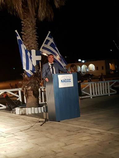 Στην ομιλία του ο κ. Φλεβάρης χαρακτήρισε τους Κασιώτες θαλασσομάχους του αγώνα για ελευθερία και εθνική ανεξαρτησία που με τα 100 και πλέον πλοία τους καταδίωκαν και κατέστρεφαν τον οθωμανικό στόλο στη Συρία, τη Λιβύη, την Αίγυπτο, την Κρήτη, την Σάμο και ολόκληρο το Αιγαίο, ως απόγονους των Σαλαμινομάχων. Σήμερα, όπως και τότε, η εθνική μας κυριαρχία δέχεται επιβουλές που πρέπει όλοι μαζί ενωμένοι και δυνατοί να αντιμετωπίσουμε. Το μήνυμα που στέλνει σήμερα η Κάσος στην οποία αν και τότε δεν είχε μείνει Ελληνική ψυχή, αναγεννήθηκε και επιδεικνύει σήμερα περήφανη και ελεύθερη την Ελληνική σημαία, διατρανώνοντας ότι η Ελληνικότητα του Αιγαίου είναι το παρόν και το μέλλον μας.
