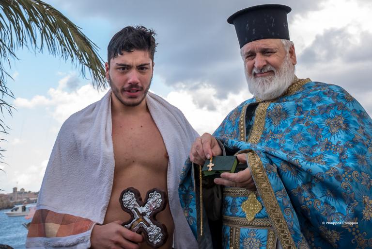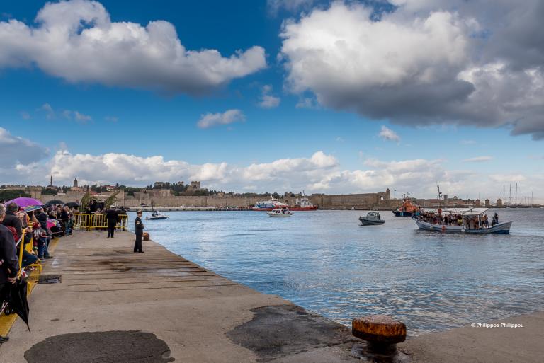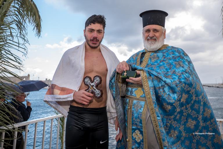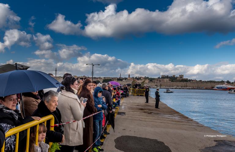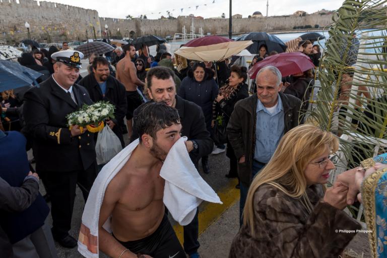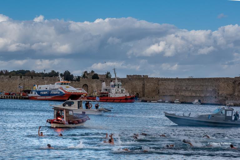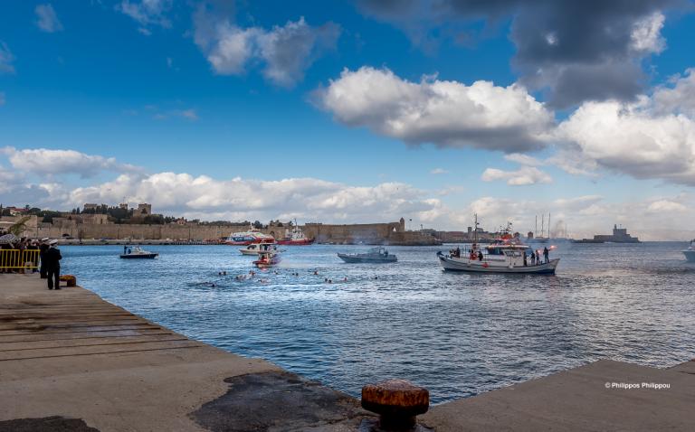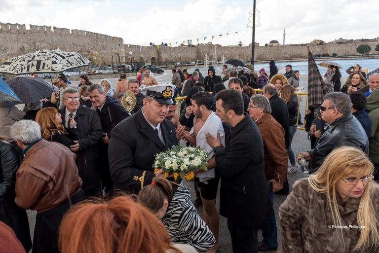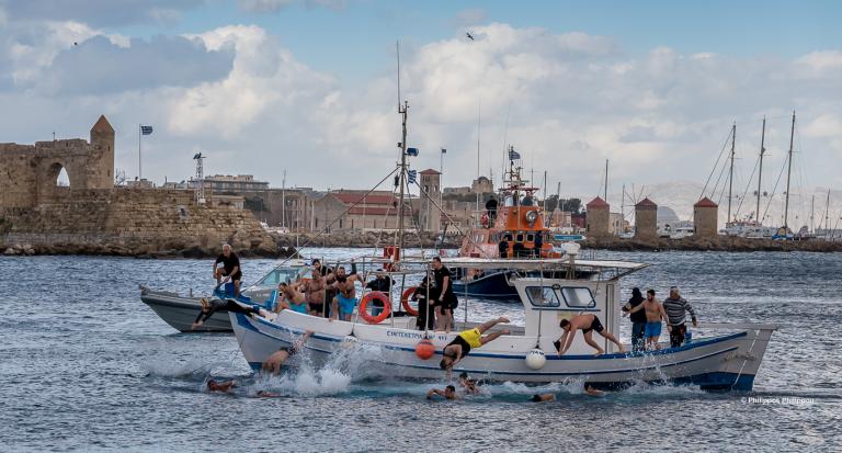 ΦΩΤΟ: Φίλιππος Φιλίππου -Πλήθος κόσμου παρακολουθούσε και εφέτος την θεία λειτουργία και τον μεγάλο αγιασμό στον Ιερό Ναό του Αγίου Παντελεήμονος της Μεσαιωνικής Πόλης της Ρόδου και την κατάδυση του Τιμίου Σταυρού στο τουριστικό λιμάνι Ρόδου από τον Παπά Χρήστο, Έπεσαν 20 άτομα και ο τυχερός που έπιασε τον Τίμιο Σταυρό από την θάλασσα είναι ο Ξυπολιτας Αντώνιος. Τη τελετή παρακολούθησε μεταξύ άλλων και ο Διοικητής του Λιμενικού στη Δωδεκάνησο Γιάννης Αργυρίου.