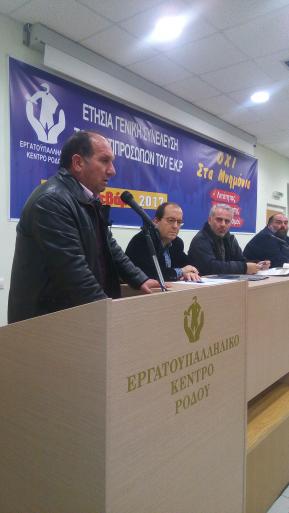 Ειδικότερα, ο διοικητικός απολογισμός εγκρίθηκε με 68 ψήφους υπέρ και 18 κατά (σε ποσοστό 80%) και ο οικονομικός απολογισμός με 70 ψήφους υπέρ και 16 κατά (ποσοστό 81,5%). Ο πρόεδρος του Εργατικού Κέντρου Ρόδου, Σάββας Χατζησάββας, κατά την ομιλία του ανέφερε ότι το Εργατικό Κέντρο θα συνεχίσει να είναι απέναντι στις αντικοινωνικές πολιτικές και στη φτωχοποίηση της ελληνικής κοινωνίας, υπερασπίζοντας τα δικαιώματα των εργαζομένων. Κλείνοντας τις εργασίας ο κ. Χατζησάββας δήλωσε: "Η εμπιστοσύνη των αντιπροσώπων μας δίνει δύναμη και μας γεμίζει με ευθύνες για την δύσκολη συνέχεια. Ευχαριστώ όλους για την παρουσία και την στήριξη τους. Δεν θα τους απογοητεύσουμε!!!!".