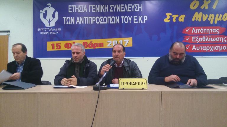 Με μεγάλη συμμετοχή αντιπροσώπων, πραγματοποιήθηκε το Ετήσιο Τακτικό Συνέδριο του Εργατικού Κέντρου Ρόδου. -Συγκεκριμένα, μετείχαν 86 αντιπρόσωποι σε σύνολο 104. Ο διοικητικός απολογισμός εγκρίθηκε με 68 υπέρ και 18 κατά, ποσοστό 80%, και ο οικονομικός απολογισμός με 70 υπέρ και 16 κατά, ποσοστό 81,5%.