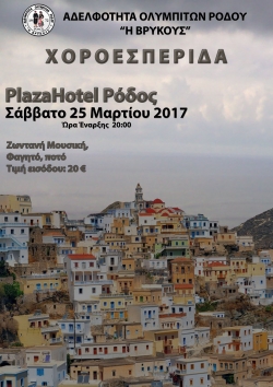 Η Αδελφότητα Ολυμπιτών Ρόδου "Η ΒΡΥΚΟΥΣ" σας προσκαλεί στην ετήσια χοροεσπερίδα της, το Σάββατο 25/3/2017 και ώρα 8:00 το βράδυ στην αίθουσα του ξενοδοχείου Πλάζα, για να διασκεδάσουμε όλοι μαζί. Η εκδήλωση θα περιλαμβάνει μουσική, φαγητό, ποτό και μια πλούσια λαχειαγορά. Προμηθευτείτε σύντομα εισιτήρια από τα Μέλη του Δ.Σ.