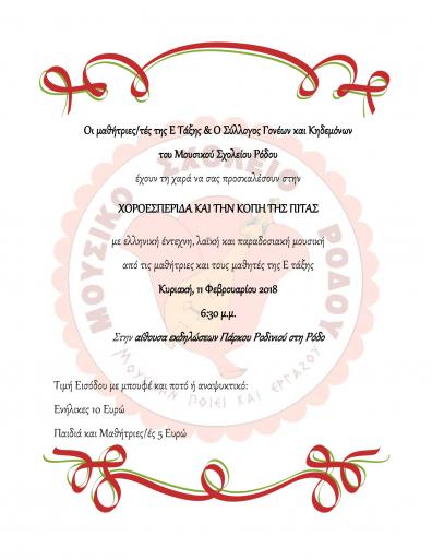 Ο Σύλλογος Γονέων και Κηδεμόνων του Μουσικού Σχολείου Ρόδου, σε συνεργασία με τη Διεύθυνση και το Σύλλογο Καθηγητών του Σχολείου, σας προσκαλεί στη χοροεσπερίδα και κοπή της Βασιλόπιτας η οποία θα πραγματοποιηθεί αυτήν τη Κυριακή 11 Φεβρουαρίου και ώρα 18:30 στην αίθουσα του Πάρκου Ροδινιού.