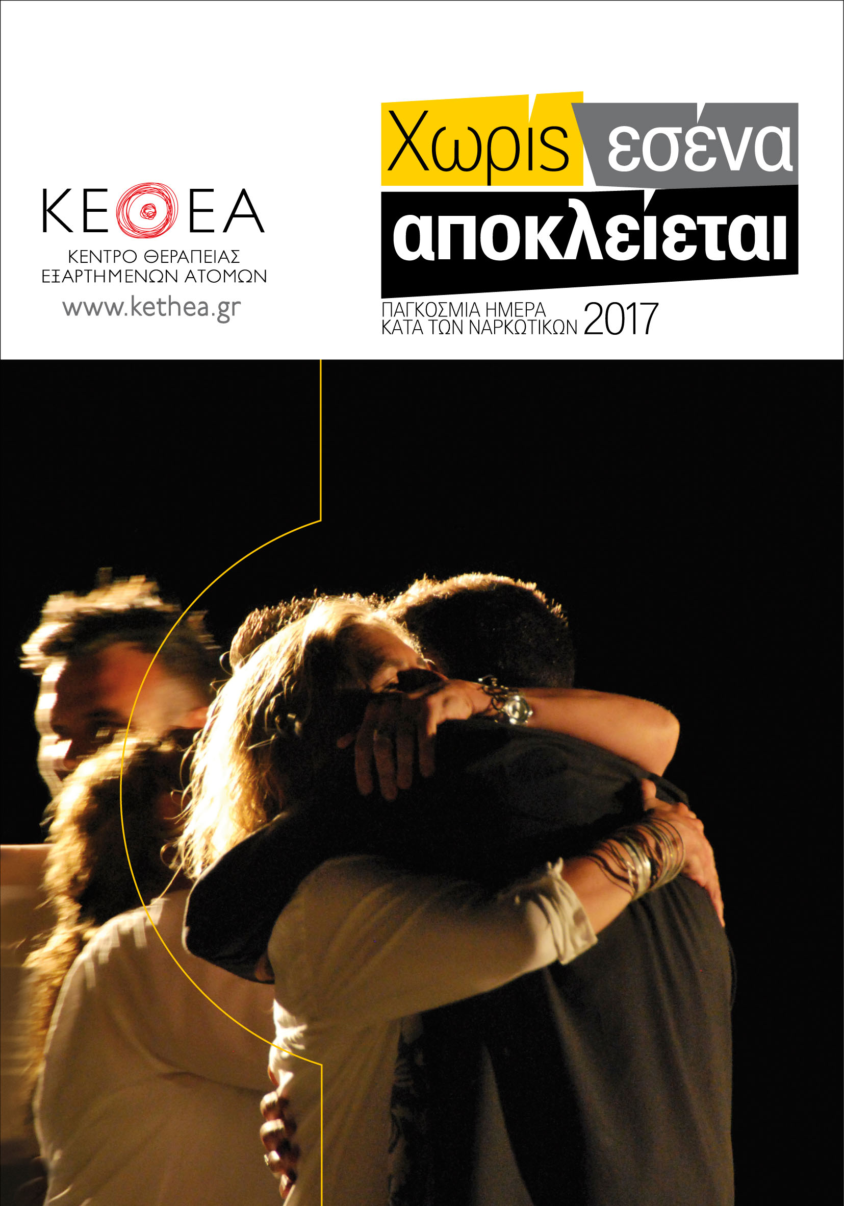ΔΕΛΤΙΟ ΤΥΠΟΥ -Ηράκλειο, 16/06/2017 -ΧΩΡΙΣ ΕΣΕΝΑ ΑΠΟΚΛΕΙΕΤΑΙ! Όλοι έχουμε κάποιον στον νου μας, όλοι μπορούμε κάτι να κάνουμε. Με αφορμή την Παγκόσμια Ημέρα κατά των Ναρκωτικών στις 26 Ιουνίου, το ΚΕΘΕΑ ΑΡΙΑΔΝΗ, σε συνεργασία με φορείς, συλλόγους, σωματεία και τη συμμετοχή τοπικών κοινωνιών, εθελοντών και φίλων, διοργανώνει εκδηλώσεις σε Ηράκλειο, Χανιά, Άγιο Νικόλαο, Ρόδο και Κάλυμνο για να διαδώσει το μήνυμα ενάντια στο στίγμα και τον αποκλεισμό και να δώσει ελπίδα στην προσπάθεια εξαρτημένων και οικογενειών για καθαρή ζωή μακριά από κάθε εξάρτηση. Ειδικότερα, το πρόγραμμα των εκδηλώσεων έχει ως εξής: Ρόδος Κυριακή 25/6/2017 και 10:00 στο πάρκο Αθλητικού και Πολιτιστικού Κέντρου Καλλιπάτειρα Περιβαλλοντική δράση με καθαρισμό και διαμόρφωση του πάρκου, από μέλη του Συμβουλευτικού Κέντρου Ρόδου με τη συνδιοργάνωση του Δήμου Ρόδου, της Αντιδημαρχείας Πρασίνου και Περιβάλλοντος, της Αντιδημαρχείας Κοινωνικής Πολιτικής και του ΔΟΠΑΡ. Κάλυμνος Σάββατο 24/06/2017 και ώρα 19:00 στοΔημοτικό Γήπεδο Καλύμνου. (ανοιχτή εκδήλωση) Ενημερωτικό Περίπτερο. Αγώνας μπάσκετ με την εθελοντική συμμετοχή του αντρικού τμήματος της Ένωσης Αττάλου Καλύμνου (Ε.Α.ΚΑ), με τη συνεργασία του Δήμου Καλυμνίων και την υποστήριξη του Συλλόγου Φίλων ΚΕΘΕΑ Καλύμνου.