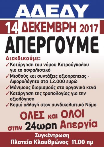 Η Α.Δ.Ε.Δ.Υ. οργανώνει και συμμετέχει και καλεί τα μέλη της να δώσουν το αγωνιστικό παρόν στην 24ωρη απεργιακή κινητοποίηση στις 14.12.2017 και στη συγκέντρωση στο Εργατικό Κέντρο Ρόδου στις 10:30 π.μ..