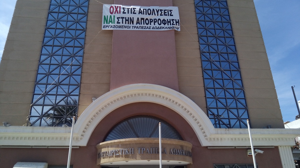 Οι εργαζόμενοι της υπό ΕιδικήΕκκαθάριση Τράπεζας Δωδεκανήσου με αφορμή τις προγραμματισμένες απολύσεις, σε συντονισμό με τους εργαζόμενους των υπολοίπων υπό Ειδική Εκκαθάριση Συνεταιριστικών Τραπεζών, αποφασίσαμε την εξαγγελία επαναλαμβανόμενων 48ωρων απεργιών μέχρι την ικανοποίηση των παρακάτω αιτημάτων μας: 1)Ματαίωση των προγραμματισμένων απολύσεων στη Συνεταιριστική Τράπεζα Δωδεκανήσου υπό Ειδική Εκκαθάριση, δεδομένου ότι η επίτευξη των στόχων της Εκκαθάρισης καθιστά αναγκαία την παρουσία του συνόλου του προσωπικού, όπως αυτό αποδεικνύεται με τα μέχρι σήμερα αποτελέσματα. 2) Πλήρης απορρόφηση των εργαζομένων της πρώην Συνεταιριστικής Τράπεζας Δωδεκανήσου από τις Τράπεζες στις οποίες μεταβιβάστηκαν οι καταθέσεις των υπό εκκαθάριση τελούντων συνεταιριστικών τραπεζών, πρακτική που ακολουθήθηκε για όλους τους εργαζόμενους των υπολοίπων εμπορικών τραπεζών, με αναγνώριση και εφαρμογή το σύνολο των εργασιακών, ασφαλιστικών και λοιπών δικαιωμάτων τους. 3) Ζητάμε ίση μεταχείριση όπως αναλόγως έπραξε η Διοίκηση της Τράπεζας της Ελλάδος για τους εργαζόμενους στις Συνεταιριστικές Τράπεζες Λήμνου- Λέσβου και Πελοποννήσου, οι οποίοι απορροφήθηκαν στο σύνολό τους από συστημικές Τράπεζες. Θυμίζουμε ότι με την ανάκληση αδείας της Τράπεζας Δωδεκανήσου αρκετοί άνθρωποι έχασαν την δουλειά τους και οι μεριδιούχοι κινδυνεύουν να χάσουν τα χρήματα τους. Το Εργατικό Κέντρο Ρόδου στηρίζει τους εργαζόμενους της Τράπεζας Δωδεκανήσου στα δίκαια αιτήματά τους.