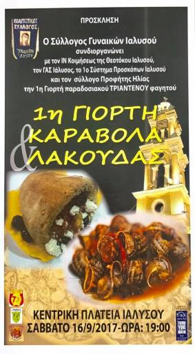 Π Ρ Ο Σ Κ Λ Η Σ Η -ΣΑΒΒΑΤΟ 16-9-2017 ώρα 7μμ Κεντρική Πλατεία στο παραδοσιακό σπίτι. Ο Σύλλογος Γυναικών Ιαλυσού συνδιοργανώνει με τον ΙΝ Κοιμήσεως της Θεοτόκου Ιαλυσού, τον Πολιτιστικό σύλλογο Προφήτης Ηλίας, τον ΓΑΣ Ιάλυσος και το 1ο Σύστημα Προσκόπων Ιαλυσού την 1η Γιορτή παραδοσιακού ΤΡΙΑΝΤΕΝΟΥ φαγητού (ΓΙΟΡΤΗ ΚΑΡΑΒΟΛΑ και ΛΑΚΚΟΥΔΑΣ) Αρωγοί στην προσπάθεια του Συλλόγου μας είναι: Ο εφημέριος του Ναού π. Χατζημιχαήλ Κωνσταντινος και η εκκλησιαστική επιτροπή. Ο πρόεδρος του ΓΑΣ κ. Χατζηνικήτας Μιχαήλ και το διοικητικό συμβούλιο. Ο κ Φούκας Ιωάννης πρόεδρος του συλλόγου Προφήτης Ηλίας. Ο Αρχηγός του συστήματος κ. Κρίκος Λάμπης οι πρόσκοποι και οι γονείς τους.
