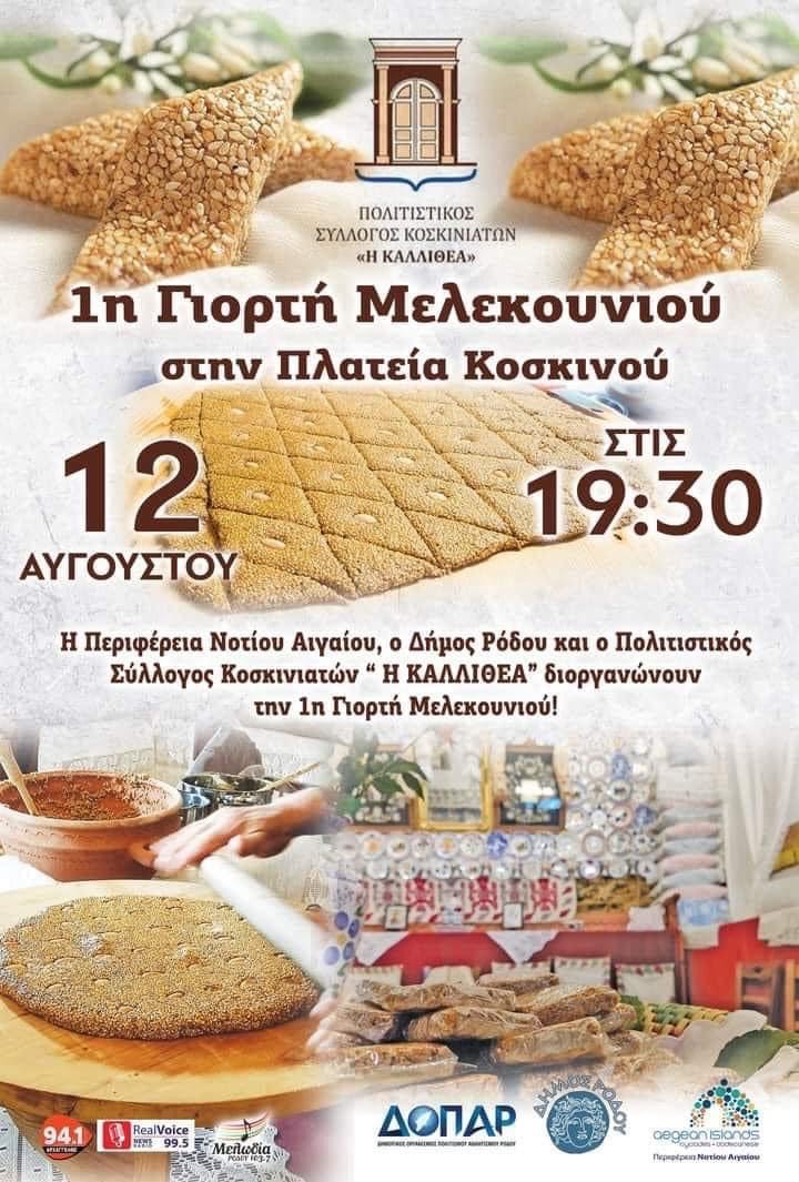 Το Σάββατο 12 Αυγούστου και ώρα 19:30 στην πλατεία Κοσκινού θα πραγματοποιηθεί η 1η Γιορτή Μελεκουνιού που διοργανώνει ο πολιτιστικός σύλλογος Κοσκινιατών «Η ΚΑΛΛΙΘΕΑ» , με τη στήριξη της περιφέρειας νοτίου Αιγαίου και του ΔΟΠΑΡ.