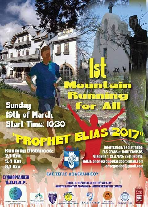 Η Ε.Α.Σ. Σ.Ε.Γ.Α.Σ. ΔΩΔΕΚΑΝΗΣΟΥ συνδιοργανώνει με το Δήμο Ρόδου και τον ΔΟΠΑΡ και σε συνεργασία με τα Σωματεία Στίβου της Ρόδου καθώς και με την Στήριξη της Περιφέρειας Νοτίου Αιγαίου, την Δημοτική Κοινότητα Σαλάκου και την Δημοτική Κοινότητα Απολλώνων, προκηρύσσει τον 1ο Αγώνα Ορεινού Δρόμου με την επωνυμία ''ΠΡΟΦΗΤΗΣ ΗΛΙΑΣ 2017΄΄ την Κυριακή, 19 Μαρτίου 2017. Πρόκειται για τον 1ο Αγώνα Ορεινού Δρόμου σύμφωνα με τους κανόνες και τις προδιαγραφές του Σ.Ε.Γ.Α.Σ., της IAAF, και της ITRA που διεξάγεται στην Ρόδο. Οι Οργανωτές ΕΚΤΟΣ από τους αθλητές και τις αθλήτριες των σωματείων μας και το οικογενειακό τους περιβάλλον, ΠΡΟΣΒΛΕΠΟΥΝ και στους ΑΝΕΞΑΡΤΗΤΟΥΣ ΔΡΟΜΕΙΣ, ΕΛΕΥΘΕΡΟΥΣ ΑΣΚΟΥΜΕΝΟΥΣ Ή ΠΕΡΙΠΑΤΗΤΕΣ, ΚΑΘΩΣ ΚΑΙ ΑΛΛΩΝ ΑΘΛΗΜΑΤΩΝ ΚΑΙ ΚΟΙΝΩΝΙΚΩΝ ΟΜΑΔΩΝ, ΠΟΥ ΚΑΛΟΥΝΤΕ ΤΑ ΜΕΛΗ ΤΟΥΣ ΝΑ ΣΥΜΜΕΤΑΣΧΟΥΝ. Ο αγώνας έχει και κοινωνικό χαρακτήρα αφού χρήματα από την εγγραφή θα δοθούν στο Κοινωνικό Παντοπωλείο της Ρόδου. ΑΠΟΣΤΑΣΕΙΣ ΔΡΟΜΩΝ Αγώνας Ορεινού Δρόμου -8,1- Χιλιομέτρων Αγώνας Ορεινού Δρόμου -5,4- Χιλιομέτρων Αγώνας Ορεινού Δρόμου -2,7- Χιλιομέτρων
