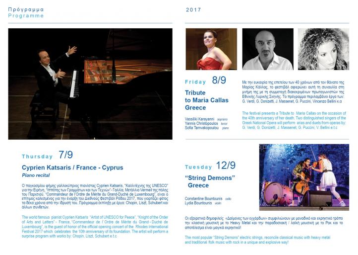 Την Παρασκευή 8 Σεπτεμβρίου με την ευκαιρία της επετείου των 40 χρόνων από τον θάνατο της Μαρίας Κάλλας, το φεστιβάλ αφιερώνει μια συναυλία στη μνήμη της με τη συμμετοχή δυο διακεκριμένων πρωταγωνιστών της Εθνικής Λυρικής Σκηνής, την Βασιλική Καραγιάννη- σοπράνο, τον Γιάννη Χριστόπουλο- τενόρο και την Σοφία Ταμβακοπούλου στο πιάνο. Την Τρίτη 12 Σεπτεμβρίου το φεστιβάλ θα αποχαιρετίσει το κοινό του με τους δημοφιλείς “String Demons” . Οι δαίμονες των εγχόρδων, Κωνσταντίνος και Λυδία Μπουντούνη, συμφιλιώνουν την κλασική μουσική με το Heavy Metal και την παραδοσιακή / λαϊκή μουσική με το Ροκ, με το μοναδικό και εκρηκτικό τους τρόπο! Το Διεθνές Φεστιβάλ Ρόδου 2017, οργανώνεται από τον πολιτιστικό οργανισμό “Διεθνές Φεστιβάλ Ρόδου, υπό την Καλλιτεχνική και Γεν. Δ/νση της Συμβούλου Διαχείρισης Πολιτισμού κ. Πηνελόπης Σερδάρη και τον Δήμο Ρόδου –Δ.Ο.Π.Α.Ρ. , υπό την αιγίδα του Υπουργείου Πολιτισμού, της Ελληνικής Εθνικής Επιτροπής της Ουνέσκο και του ΕΟΤ