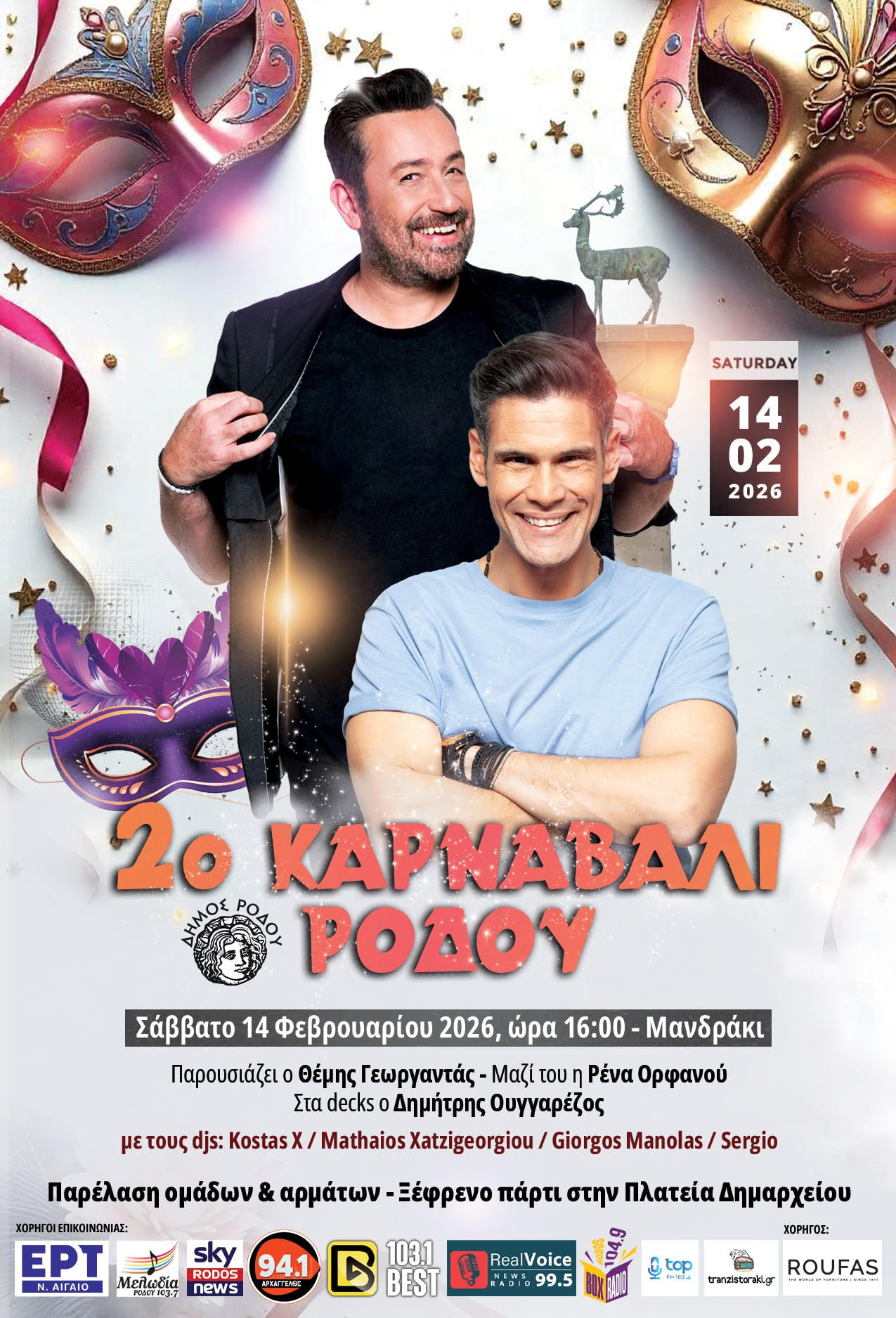 Μετά την ολοκλήρωση της παρέλασης, το κέφι μεταφέρεται στην Πλατεία Δημαρχείου, όπου θα ακολουθήσει μεγάλο αποκριάτικο πάρτι και θα κρατήσει μέχρι αργά, χαρίζοντας σε κατοίκους και επισκέπτες μια βραδιά γεμάτη μουσική, χορό και γιορτινή διάθεση. Το 2ο Καρναβάλι Ρόδου δεν αποτελεί απλώς μια εκδήλωση, αλλά μια συλλογική εμπειρία χαράς και εξωστρέφειας που φιλοδοξεί να γίνει θεσμός και να γεμίσει το νησί με φως, ρυθμό και χαμόγελα. Η Ρόδος γιορτάζει και προσκαλεί όλους να γίνουν μέρος της πιο «δυνατής» αποκριάτικης εκδήλωσης.