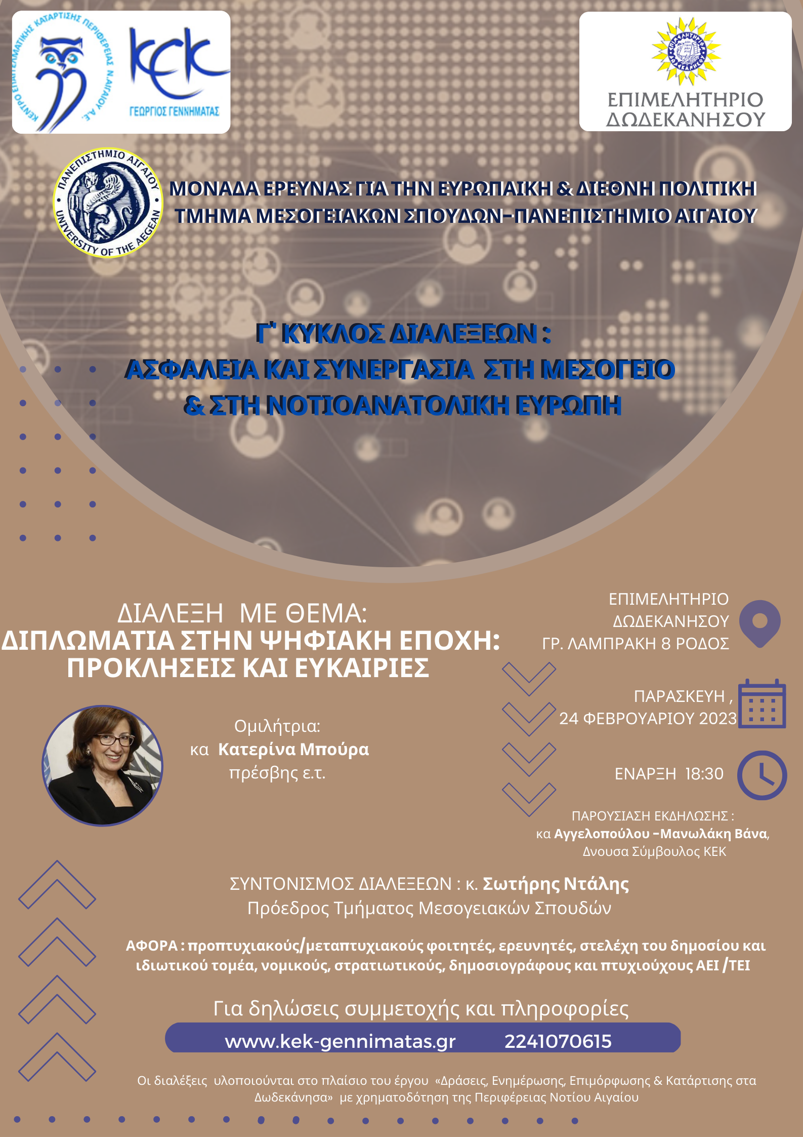 - Η Μονάδα Έρευνας για την Ευρωπαϊκή & Διεθνή Πολιτική του Τμήματος Μεσογειακών Σπουδών του Πανεπιστήμιου Αιγαίου, το Επιμελητήριο Δωδεκανήσου και το Κ.Ε.Κ. Γεννηματάς της Περιφέρειας Νοτίου Αιγαίου συνδιοργανώνουν το Γ’ Κύκλο Σεμιναρίων με θέμα: ΑΣΦΑΛΕΙΑ ΚΑΙ ΣΥΝΕΡΓΑΣΙΑ ΣΤΗ ΜΕΣΟΓΕΙΟ & ΣΤΗ ΝΟΤΙΟΑΝΑΤΟΛΙΚΗ ΕΥΡΩΠΗ, υπό τον συντονισμό του Αναπληρωτή Καθηγητή και Πρόεδρου του Τμήματος Μεσογειακών Σπουδών κ. Σωτήρη Ντάλη.