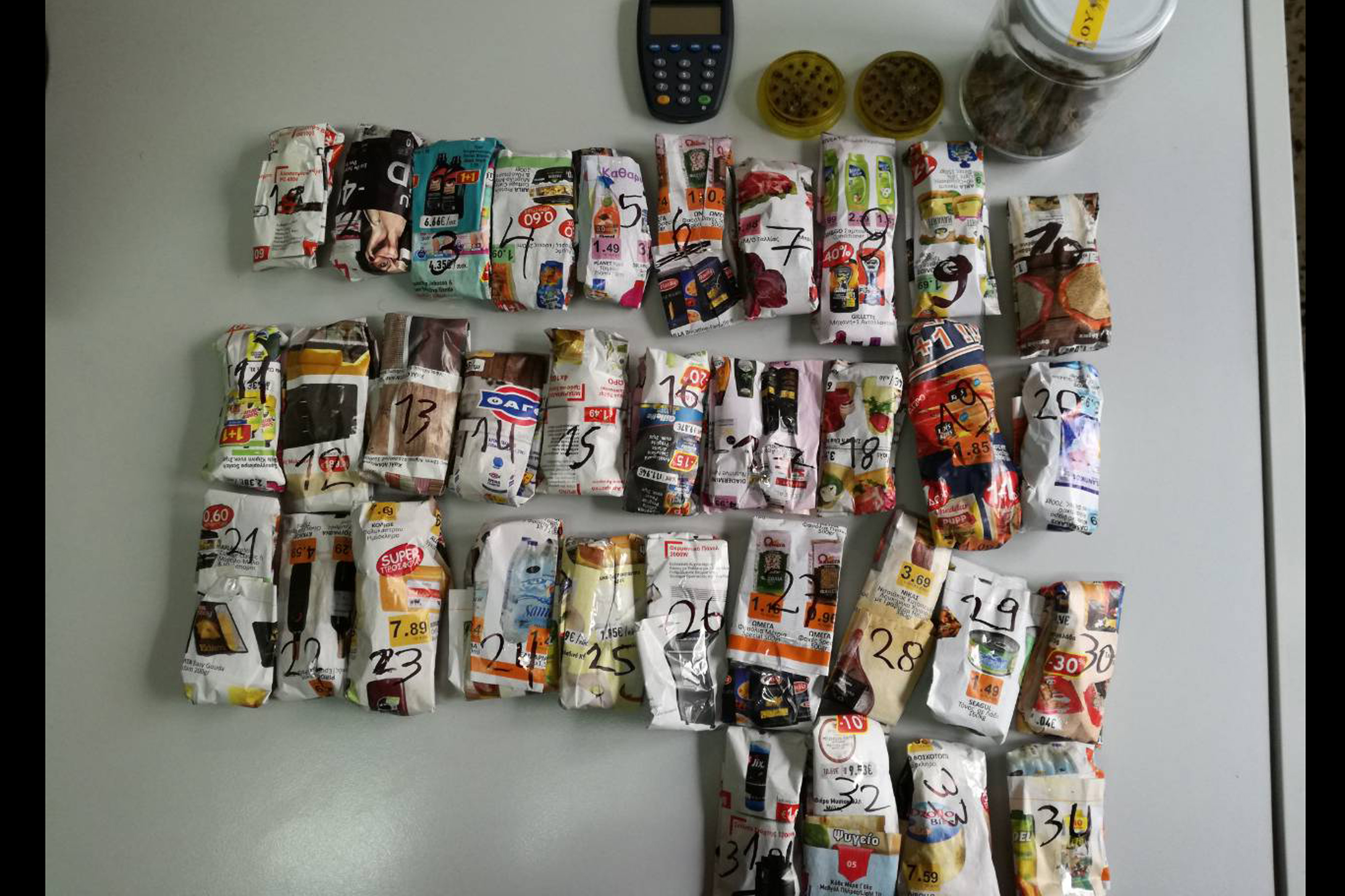 • Ακατέργαστη κάνναβη συνολικού βάρους 436,6 γραμμαρίων τοποθετημένη σε 34 συσκευασίες, έτοιμη προς διάθεση • Θρυμματιστή κάνναβης • Μαχαίρι με λάμα μήκους 12 εκατοστών