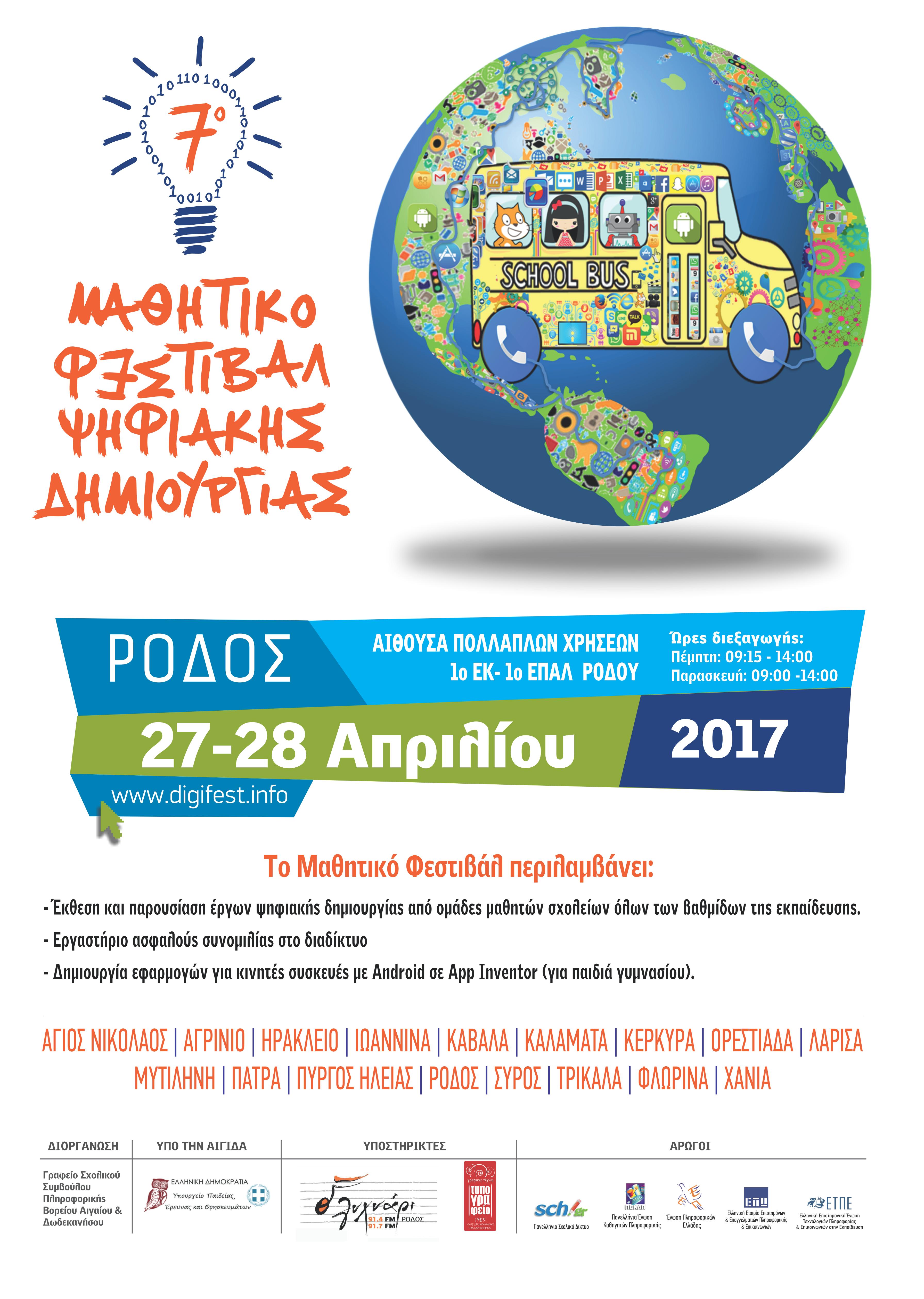 Δελτίο τύπου-7ο Μαθητικό Φεστιβάλ Ψηφιακής Δημιουργίας στο 1ο Ε.Κ και 1ο ΕΠΑΛ Ρόδου -Το Μαθητικό Φεστιβάλ Ψηφιακής Δημιουργίας (www.digifest.info) αποτελεί μια πρωτοβουλία ανάδειξης μαθητικών έργων που έχουν δημιουργηθεί στο πλαίσιο μαθημάτων Πληροφορικής ή διαθεματικών έργων (projects) με τη χρήση Τεχνολογιών Πληροφορικής και Επικοινωνιών. Πραγματοποιείται από το 2013 με μεγάλη επιτυχία σε πανελλήνιο επίπεδο σε διάφορες πόλεις της Ελλάδας. Για το σχολικό έτος 2016-17 το 7ο Μαθητικό Φεστιβάλ Ψηφιακής Δημιουργίας θ α δ ι ε ξ α χ θ ε ί π α ρ ά λ λ η λ α σ ε Ηράκλειο, Άγιο Νικόλαο, Αγρίνιο, Ιωάννινα, Καβάλα, Καλαμάτα, Κέρκυρα, Ορεστιάδα, Κομοτηνή, Λάρισα, Μυτιλήνη, Πάτρα, Πύργο Ηλείας, Ρόδο, Σύρο, Τρίκαλα, Φλώρινα και Χανιά. Στην πόλη της Ρόδου, το 7ο Μαθητικό Φεστιβάλ Ψηφιακής Δημιουργίας θα διεξαχθεί στο 1ο ΕΚ και 1ο ΕΠΑΛ Ρόδου την Πέμπτη 27 και την Παρασκευή 28 Απριλίου από τις 9:00 έως και τις 14:00. Το Φεστιβάλ αποτελεί ένα σπουδαίο θεσμό για την εκπαιδευτική κοινότητα, ένα σημείο συνάντησης σχολείου και κοινωνίας και τελεί και φέτος υπό την Αιγίδα του Υπουργείου Παιδείας, Έρευνας και Θρησκευμάτων (158058/Δ2/27-09-2016). Στο πλαίσιο του Μαθητικού Φεστιβάλ θα υπάρξει η δυνατότητα να παρουσιαστούν και να εκτεθούν ψηφιακά έργα, έργα ρομποτικής και Πληροφορικής, καλλιτεχνικά έργα, ταινίες, βίντεο, animation, παρουσιάσεις, τα οποία δημιουργήθηκαν στο πλαίσιο μαθημάτων Πληροφορικής όλων των βαθμίδων ή στο πλαίσιο κάποιας Σχολικής δραστηριότητας (Περιβαλλοντική, Πολιτιστική, Αγωγής Υγείας κ.ά.) ή στο πλαίσιο κάποιου διαθεματικού/διεπιστημονικού σχεδίου συνεργασίας μεταξύ του μαθήματος της Πληροφορικής και άλλων μαθημάτων. Επίσης θα διεξαχθούν παράλληλα τα εξής εργαστήρια: • Εργαστήριο Ασφαλούς συνομιλίας στο διαδίκτυο (για μαθητές Δημοτικού Σχολείου) • Δημιουργία εφαρμογών για κινητές συσκευές με android σε app inventor (για μαθητές γυμνασίου και Α΄ Λυκείου) Στο φεστιβάλ συμμετέχουν περισσότεροι από 300 μαθητές, 33 έργα, 40 εκπαιδευτικοί, 25 σχολεία πρωτοβάθμιας και δευτεροβάθμιας εκπαίδευσης από τη Ρόδο και άλλα νησιά της Δωδεκανήσου. Η Τοπική Οργανωτική Επιτροπή Δωδεκανήσου αποτελείται από τους εκπαιδευτικούς: • Θεοφανέλλης Τιμολέων, Σχολικός Σύμβουλος ΠΕ19, Δωδεκανήσου & Β. Αιγαίου • Κεφαλάκης Παύλος, ειδικότητας ΠΕ19, Διευθυντής 1ου Ε.Κ. Ρόδου. • Καραμήτσας Ιωάννης, ειδικότητας ΠΕ17.03, Διευθυντής 1ου ΕΠΑΛ Ρόδου. • Σπανός Δημήτριος, ειδικότητας ΠΕ19, καθηγητής στο 1ο ΕΠΑΛ Ρόδου. • Αμβροσιάδης Εμμανουήλ, ειδικότητας ΠΕ19, Υποδιευθυντής 1ου Ε.Κ. Ρόδου. • Στελλάς Εμμανουήλ, ειδικότητας ΠΕ 17.02, Υπεύθυνος τομέα 1ου Ε.Κ. Ρόδου. • Μπαρμπαλής Εμμανουήλ, ειδικότητας ΠΕ19, Υπεύθυνος τομέα 1ου Ε.Κ. Ρόδου. • Αχθοφορίδου Γεωργία, ειδικότητας ΠΕ14.04, Υπεύθυνη τομέα 1ου Ε.Κ. Ρόδου. • Αλαφάκη Δήμητρα, ειδικότητας ΠΕ17.03, Υπεύθυνη τομέα 1ου Ε.Κ. Ρόδου. • Γιαννεσκής Φίλιππος, ειδικότητας ΠΕ17.08, Υπεύθυνος τομέα 1ου Ε.Κ. Ρόδου. • Κοκκίνου Αστραδενή, ειδικότητας ΠΕ20, καθηγήτρια στο 1ο ΕΠΑΛ Ρόδου. • Ημέλλου Ευδοξία, ειδικότητας ΠΕ18.26, καθηγήτρια στο 1ο ΕΠΑΛ Ρόδου. • Σέντης Πέτρος, ειδικότητας ΠΕ19, καθηγητής στο Εσπερινό ΕΠΑΛ Ρόδου • Χατζηνικόλας Κωνσταντίνος, ειδικότητας ΠΕ19, καθηγητής στο 1ο ΕΠΑΛ Ρόδου Ώρες φεστιβάλ: Πέμπτη 27 Απριλίου 9:15 – 18:00 και Παρασκευή 28 Απριλίου 09:00 – 14:00.