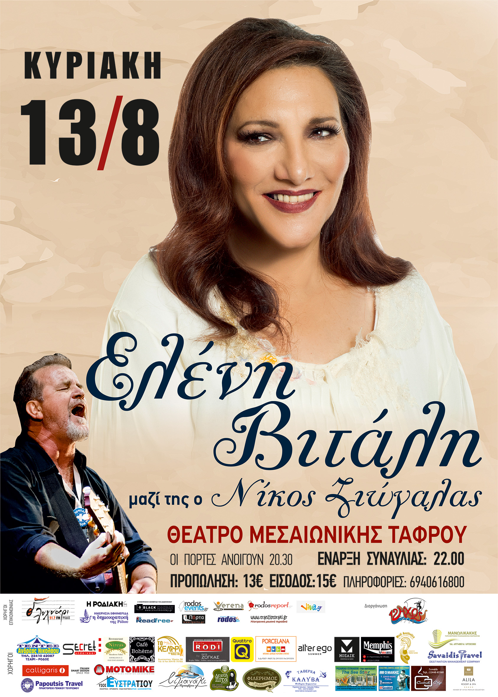 7 λόγοι για να πας στη μεγάλη συναυλία της Ελένης Βιτάλη στο Θέατρο της Μεσαιωνικής Τάφρου στις 13/8!!! 1. Έχει 12 χρόνια να εμφανιστεί σε συναυλία στο νησί της Ρόδου 2. Είναι μια από τις κορυφαίες ελληνίδες ερμηνεύτριες που έχει γράψει την δική της ιστορία στο ελληνικό τραγούδι. 3. Η φωνή της έχει ιδιαίτερα μεγάλη έκταση , που με το πέρασμα των χρόνων γίνετε ολοένα και καλύτερη, οι συνάδελφοι της την ξεχωρίζουν και ο κόσμος την αγαπάει ακόμα περισσότερο. 4. Γιατί μαζί της θα είναι ο καταξιωμένος έλληνας τραγουδοποιός και τραγουδιστής Νίκος Ζιώγαλας, τα τραγούδια του οποίου τον κατατάσσουνστο μουσικό χώρο εκεί όπου συναντιέται η δημοτική μουσική με την ροκ και τον ηλεκτρονικό ήχο. 5. Γιατί μαζί της θα απολαύσουμε μερικούς από τους κορυφαίους Έλληνες μουσικούς σολίστες όπως Μάνος Αχαλινωτόπουλος στο κλαρίνο Θανάσης Βασιλάς στο μπουζούκι καιTigranSargsyan στις φλογέρες 6. Γιατί η Ελένη Βιτάλη εκτός από τεράστια τραγουδίστρια είναι και πολύ καλή στιχουργός καθώς έχει γράψει μεγάλα σουξέ, όπως «Το απέναντι Μπαλκόνι» και το «Ποιος φοβάται την Βιρτζίνια Γουλφ» 7. Γιατί τι καλύτερο θα μπορούσε να μας συμβεί ,από μια Αυγουστιάτικη βραδιά, στο υπέροχο θέατρο Μεσαιωνικής Τάφρου παρέα με την Ελένη Βιτάλη, τον Νίκο Ζιώγαλα και τους συνοδοιπόρους τους. Μια συναυλία σταθμός που δεν πρέπει να χάσει κανείς!!