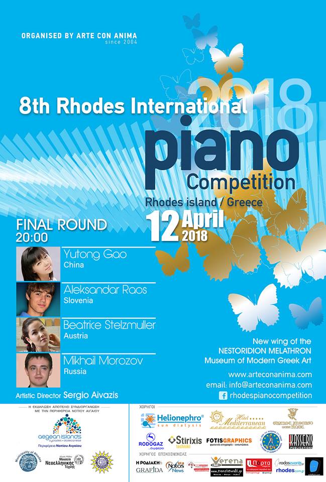 Στην τελική φάση του διαγωνισμού, θα έχουμε την ευκαιρία να παρακολουθήσουμε τους 4 φιναλίστ οι οποίοι προέρχονται από την Αυστρία, την Κίνα, την Σλοβενία και την Ρωσία. Πρόκειται για έναν εξαιρετικά υψηλού καλλιτεχνικού και αριστοτεχνικού επιπέδου διαγωνισμό που προσελκύει νέα ταλέντα από όλη την υφήλιο. Από το 2004 έως σήμερα, έλαβαν μέρος περισσότεροι από 300 πιανίστες από 32 χώρες. Την κριτική επιτροπή του διαγωνισμού έχουν τιμήσει με την παρουσία τους καταξιωμένοι πιανίστες και μουσικοί παιδαγωγοί από την Ελλάδα και το εξωτερικό. Μεταξύ αυτών είναι οι: France Clidat, Dora Bakopoulou, Cyprien Katsaris, David Lively, Alberto Portugheis, Vladimir Viardo, Marian Rybicky, Natalia Michailidou και πολλοί άλλοι. Ο Διεθνής Διαγωνισμός Πιάνου της Ρόδου ξεκίνησε το 2004 και διοργανώνεται κάθε δύο χρόνια από την arte con anima της οποίας ιδρυτής και καλλιτεχνικός διευθυντής είναι ο Σέργιος Αϊβάζης. O Διαγωνισμός διοργανώνεται από την Περιφέρεια Νοτίου Αιγαίου, τον Δήμο Ροδου- Μουσείο Νεοελληνικής Τέχνης και το Επιμελητήριο Δωδεκανήσου.