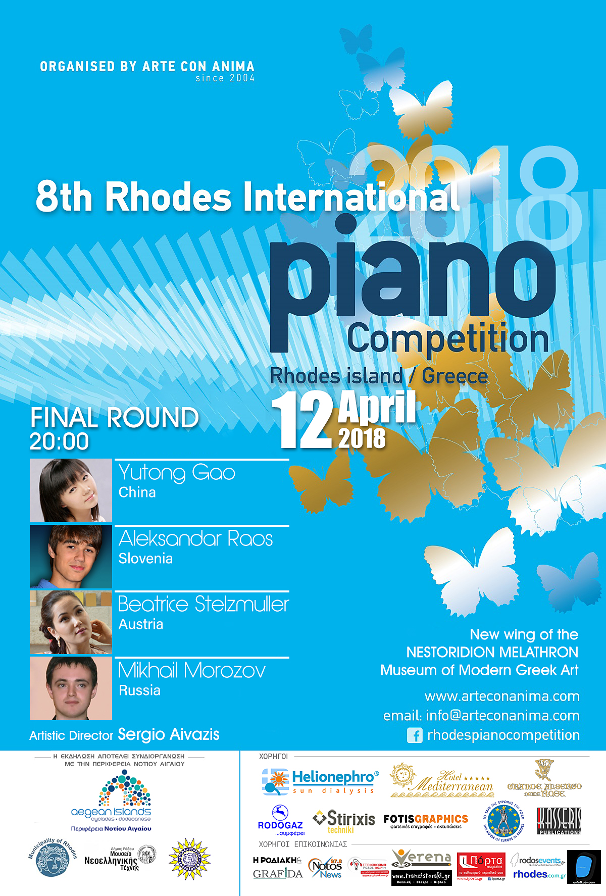 Δελτίο Τύπου-8ος Διεθνής Διαγωνισμός Πιάνου Ρόδου-Arte Con Anima Στις 12 Απριλίου 2018 στην τελική φάση του 8ου Διεθνούς Διαγωνισμού Πιάνου Ρόδου στην Νέα Πτέρυγα του Νεστορίδειου Μελάθρου, θα διαγωνιστούν 4 πιανίστες από την Κίνα, Σλοβενία, Αυστρία και Ρωσία. Τα κομμάτια που θα παρουσιάσουν οι 4 φιναλίστ είναι τα παρακάτω: