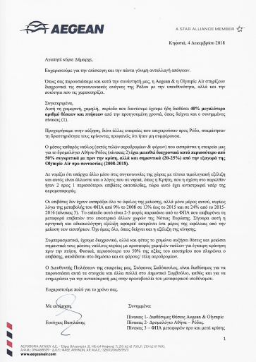 Σε συνέχεια της συνάντησης του Προέδρου της AEGEAN κ. Ευτύχιου Βασιλάκη και του Δημάρχου Ρόδου κ. Φώτη Χατζηδιάκου, που πραγματοποιήθηκε εχθές στα γραφεία της AEGEAN, σας αποστέλλουμε για ενημέρωση σας την επιστολή που εστάλη σήμερα από τον κ. Βασιλάκη προς τον κ. Χατζηδιάκο.