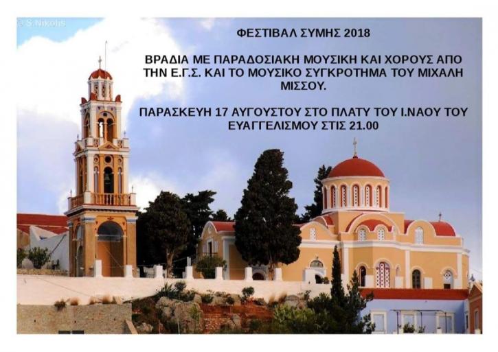 Το Φεστιβάλ Σύμης και η Ένωση Γυναικών Σύμης διοργανώνουν στο πλατύ της Παναγίας του Ευαγγελισμού στις 17 Αυγούστου και ώρα 21:00 βραδιά με παραδοσιακή μουσική και χορούς. Παίζει το μουσικό συγκρότημα του Μιχάλη Μισσού. Σας προσκαλούμε όλους να τιμήσουμε την Παναγία και να καθιερώσουμε σε συνεργασία με την Ιερά Μητρόπολη Σύμης μια βραδιά αφιερωμένη στην παράδοση και την ιστορία του τόπου μας.
