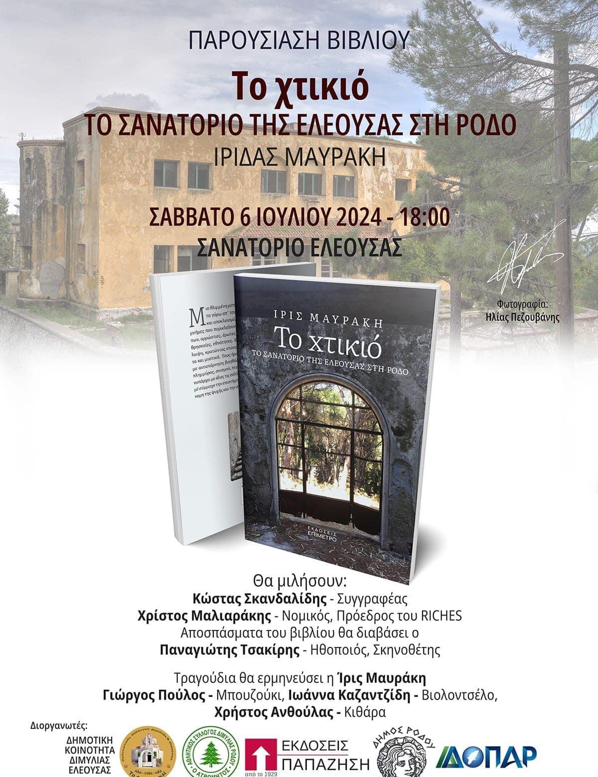Στις 6 Ιουλίου και ώρα 18:00 στο πρώην Σανατόριο στην Ελεούσα, θα πραγματοποιηθεί η παρουσίαση του βιβλίου "Το Χτικιό" της Ίριδας Μαυράκη.