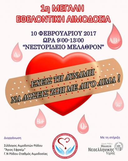 ΕΘΕΛΟΝΤΙΚΗ ΑΙΜΟΔΟΣΙΑ ΣΤΟ ΝΕΣΤΟΡΙΔΕΙΟ 10/02 Στην προσπάθεια του Συλλόγου για καλύτερη οργάνωση και μεγαλύτερη προσέλευση των Αιμοδοτών στην 1η ΜΕΓΑΛΗ Εθελοντική Αιμοδοσία του Έτους 2017, που θα πραγματοποιηθει στης 10/02/17 στο Νεστοριδειο Μέλαθρον, σας αποστέλλουμε την αφίσα την οποία σας παρακαλούμε να την τοποθετήσετε στην αρχική σας σελίδα στα site και στις εφημερίδες σας η οπουδήποτε μπορείτε. Η κοινωνία έχει ανάγκη την συνεχή βοήθεια σας σε αυτό το πολύ λεπτό θέμα που ονομάζεται ΑΙΜΟΔΟΣΙΑ. Πρέπει να σταματήσουμε την εισαγωγή αίματος από την Ελβετία αλλά ταυτόχρονα να υπάρχει διαθέσιμο αίμα για όποιον το χρειαστεί. Ο Σύλλογος μας βοηθά το Νοσοκομείο της Ρόδου και δεν έχει κάποια τράπεζα. Την επόμενη βδομάδα θα σας στείλουμε και το δελτίο τύπου. Ευελπιστούμε στην θετική σας ανταπόκριση.
