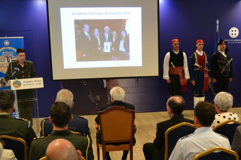 Ο κ. Παπαδόπουλος παρουσίασε με διαφάνειες την τεκμηρίωση και τις ιστορικές αναφορές της ενδυμασίας, για να καταλήξει στην τελική πρόταση του “πως” είναι η στολή πλέον , που εντάσσεται στην Προεδρική Φρουρά. Καταλήγοντας προς την Α.Ε. τον κ. Πρόεδρο της Δημοκρατίας, που αγκάλιασε την όλη προσπάθεια είπε :