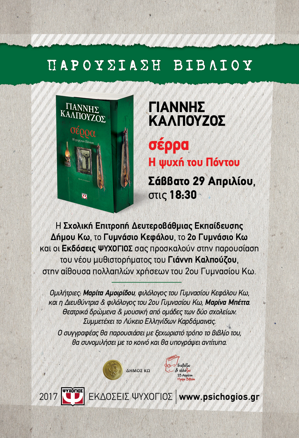 Τόπος: Αίθουσα πολλαπλών χρήσεων του 2ου Γυμνασίου Κω -Ημερομηνία: Σάββατο 29/04/2017 18:30 μμ -Η Σχολική Επιτροπή Δευτεροβάθμιας Εκπαίδευσης Δήμου Κω, το Γυμνάσιο Κεφάλου, το 2ο Γυμνάσιο Κω και οι Εκδόσεις ΨΥΧΟΓΙΟΣ σας προσκαλούν στην παρουσίαση του νέου μυθιστορήματος του Γιάννη Καλπούζου, στην αίθουσα πολλαπλών χρήσεων του 2ου Γυμνασίου Κω. Ομιλήτριες: Μαρίτα Αμοιρίδου, φιλόλογος του Γυμνασίου Κεφάλου Κω, και η Διευθύντρια & φιλόλογος του 2ου Γυμνασίου Κω, Μαρίνα Μπέττα. Θεατρικά δρώμενα & μουσική από ομάδες των δύο σχολείων. Συμμετέχει το Λύκειο Ελληνίδων Καρδάμαινας. Ο συγγραφέας θα παρουσιάσει με ξεχωριστό τρόπο το βιβλίο του, θα συνομιλήσει με το κοινό και θα υπογράψει αντίτυπα.