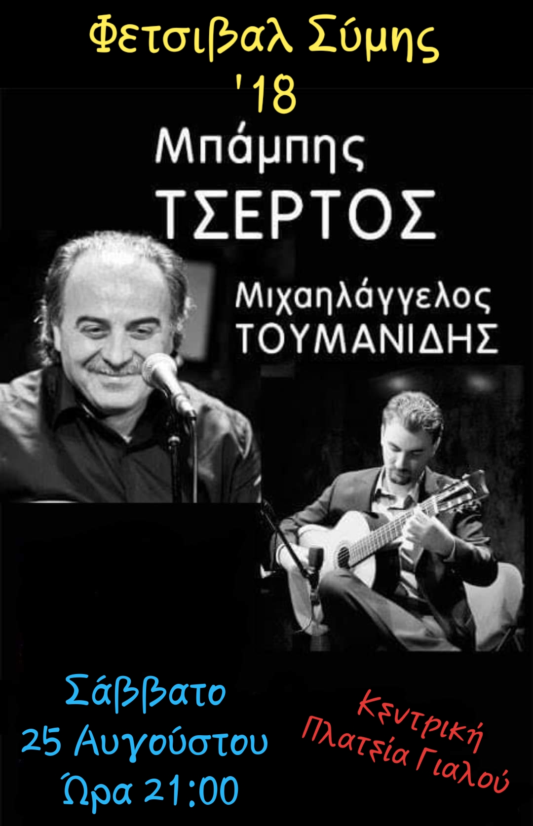 Ο Δήμαρχος Σύμης Ελ. Παπακαλοδούκας σάς καλεί σε μια συναυλία στο πλαίσιο του Φεστιβάλ Σύμης '18 που θα αφήσει το στίγμα της για την αυθεντικότητα και την απλότητά της!!! Μια φωνή, μια κιθάρα!!! Μπάμπης Τσέρτος και Μιχαλάγγελος Τουμανίδης. Είσοδος ελεύθερη !!