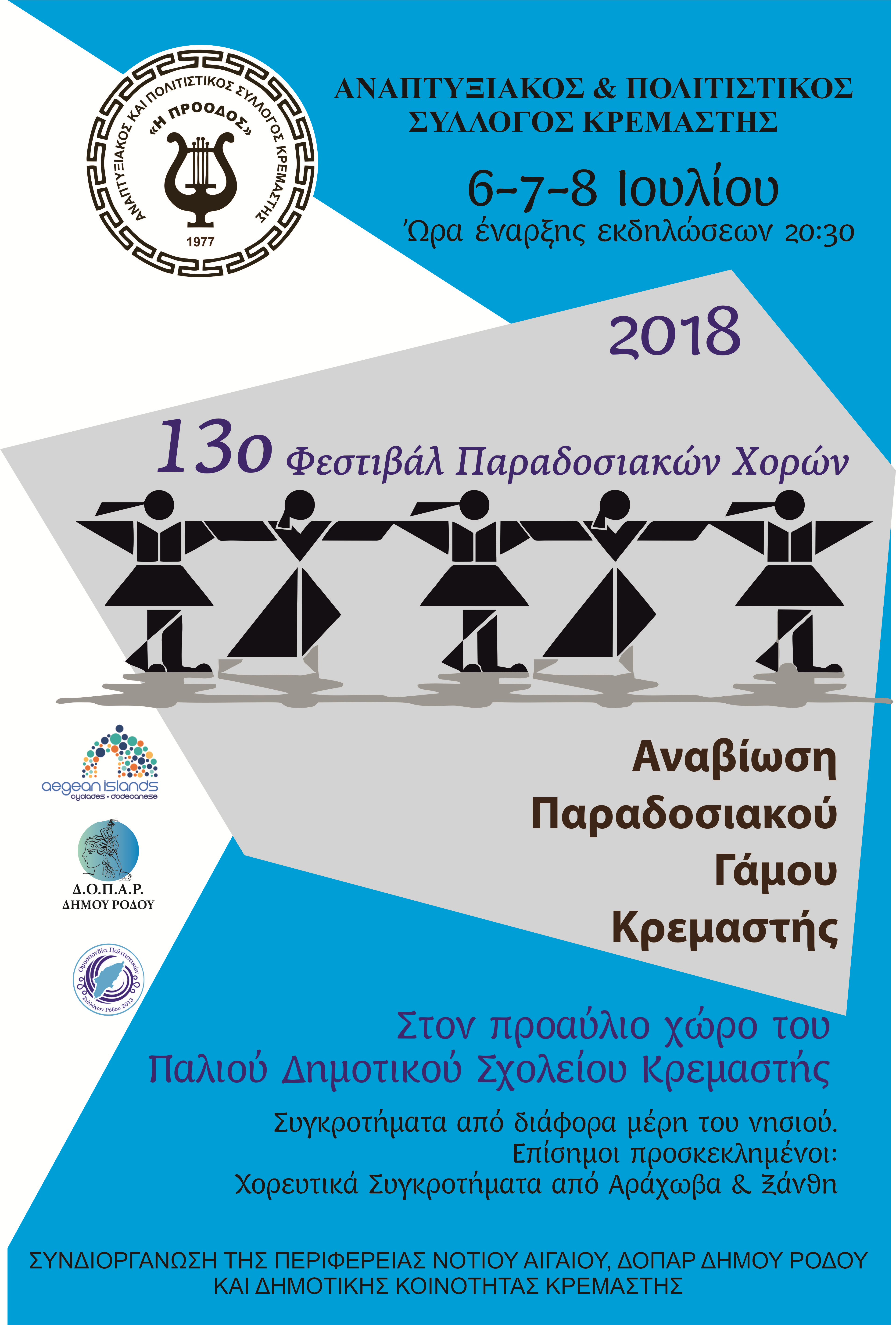 ΑΝΑΠΤΥΞΙΑΚΟΣ & ΠΟΛΙΤΙΣΤΙΚΟΣ-Ρόδος 15.06.2018 ΣΥΛΛΟΓΟΣ ΚΡΕΜΑΣΤΗΣ « Η ΠΡΟΟΔΟΣ » -ΔΕΛΤΙΟ ΤΥΠΟΥ -Ο Αναπτυξιακός και Πολιτιστικός Σύλλογος Κρεμαστής «Η ΠΡΟΟΔΟΣ» διοργανώνει το 13ο Φεστιβάλ Παραδοσιακών Χορών στις 6 , 7 & 8 Ιουλίου 2018 στον αύλειο χώρο του παλαιού Δημοτικού Σχολείου Κρεμαστής. Στο Φεστιβάλ φέτος, εκτός από τα τοπικά συγκροτήματα του νησιού μας, θα συμμετέχουν : Ο πολιτιστικός Σύλλογος «ΕΒΡΙΤΩΝ» Ξάνθης και ο λαογραφικός όμιλος ΑΡΑΧΩΒΑΣ νομού Βοιωτίας. Την Κυριακή 8 Ιουλίου θα αναβιώσουμε τον παραδοσιακό γάμο Κρεμαστής για να θυμηθούν οι παλαιότεροι και να μάθουν οι νεώτεροι. Κατά τη διάρκεια του Φεστιβάλ θα χορέψει για πρώτη φορά το Τμήμα αρχαρίων του Συλλόγου μας, ανεξαρτήτου ηλικίας. Μουσικοί, χορευτές και χορεύτριες, μικροί και μεγάλοι θα δώσουν τον καλύτερο εαυτό τους για να παρουσιάσουν ένα όμορφο Πρόγραμμα. Κατά τη διάρκεια των εκδηλώσεων, στο χώρο του Φεστιβάλ, θα διατίθενται σουβλάκια, αναψυκτικά και ποτά. Θα ακολουθήσει Ανακοίνωση με το αναλυτικό Πρόγραμμα του Φεστιβάλ. Σας περιμένουμε στο μοναδικό αυτό τριήμερο για να διασκεδάσουμε για άλλη μια χρονιά με χορούς και τραγούδια της Παράδοσής μας.