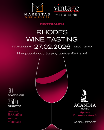 Την Παρασκευή 27 Φεβρουαρίου, στο ξενοδoχείοACANDIA στη Ρόδο, από τις 12:00 έως τις 21:00, οι επισκέπτες θα έχουν την ευκαιρία να εξερευνήσουν έναν εντυπωσιακό κόσμο κρασιού, με περισσότερα από 60 οινοποιεία και πάνω από 350 επιλεγμένες ετικέτες, καθεμία με τη δική της ιστορία, ταυτότητα και αρωματικό χαρακτήρα.
