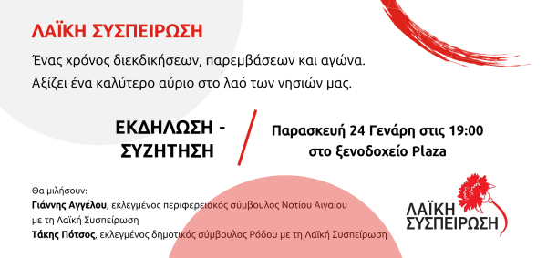 Εκδήλωση – συζήτηση θα πραγματοποιηθεί την Παρασκευή 24 Ιανουαρίου στο ξενοδοχείο Plaza και ώρα 19:00 για τον απολογισμό δράσης της «Λαϊκής ...