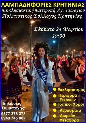 Η εκκλησιαστική επιτροπή Αγίου Γεωργίου και ο πολιτιστικός σύλλογος Κρητηνίας σας προσκαλούν στις λαμπαδηφορίες για τον εορτασμό της επανάστασης του 1821, το Σάββατο 24 ...