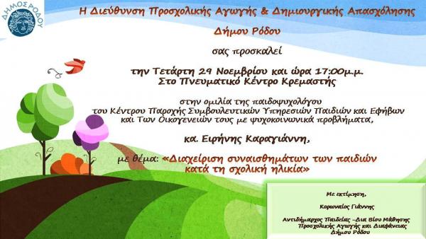 Δελτίο Τύπου-Θέμα: Ομιλίες με τις παιδοψυχολόγους του Δήμου Ρόδου, σε Κρεμαστή αι Ρόδο