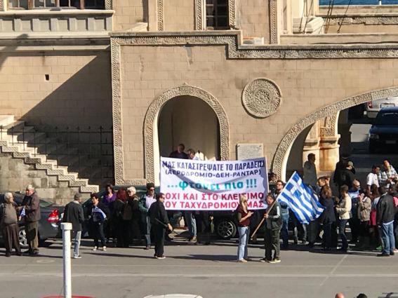 Με πανό που έγραφε: Μας καταστρέψατε το Παραδείσι ( Αεροδρόμιο-ΔΕΗ-Ραντάρ)...φτάνει πια!!!!Οχι και στο κλείσιμο του Ταχυδρομείου μας" κάτοικοι απο το χωριό αλλά και απο τα γύρω ...