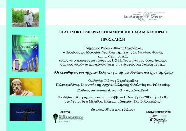 Το Μουσείο Νεοελληνικής Τέχνης του Δήμου Ρόδου στο Νεστορίδειο Μέλαθρον, τιμά κάθε χρόνο τη μνήμη της Πάολα Νεστορίδου, της μεγάλης ευεργέτιδας της Ρόδου με την θεσμοθέτηση ...