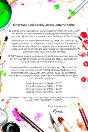 Το Διεθνές Κέντρο Συγγραφέων και Μεταφραστών Ρόδου του ΔΟΠΑΡ προσκαλεί παιδιά 8-12 ετών να λάβουν μέρος στο εργαστήριο δημιουργικής απασχόλησης που θα πραγματοποιηθεί τον ...