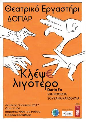 ΔΕΛΤΙΟ ΤΥΠΟΥ-Το θεατρικό εργαστήρι του Δημοτικού Οργανισμού Πολιτισμού Αθλητισμού Ρόδου θα παρουσιάσει την ανατρεπτική κωμωδία «Κλέψε λιγότερο» του Ιταλού συγγραφέα ...