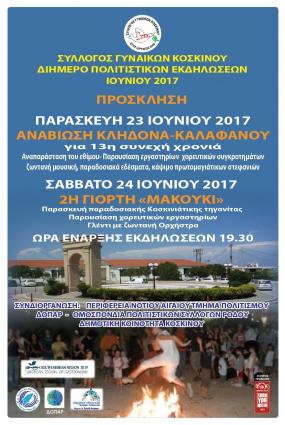 ΔΕΛΤΙΟ ΤΥΠΟΥ-Ο Πολιτιστικός Σύλλογος Γυναικών Κοσκινού , θα πραγματοποιήσει διήμερο εκδηλώσεων στις 23 & 24 Ιουνίου 2017 στην κεντρική πλατεία της Δημοτικής Κοινότητας Κοσκινού....