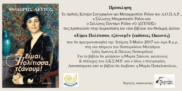 Το Διεθνές Κέντρο Συγγραφέων και Μεταφραστών Ρόδου του ΔΟΠΑΡ, ο Σύλλογος Μικρασιατών Ρόδου και ο Σύλλογος Ποντίων Ρόδου "Ο Διγενής" σας προσκαλούν στην παρουσίαση του βιβλίου...