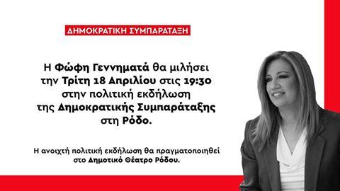 Πάσχα στη Ρόδο θα κάνει η πρόεδρος της Δημοκρατικής Συμπαράταξης, Φώφη Γεννηματά.