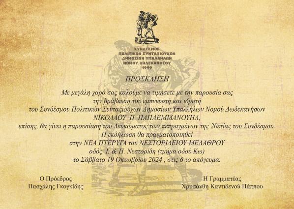 Σας ενημερώνουμε ότι στις 19 Οκτωβρίου 2024, ημέρα Σάββατο και ώρα 18:00, ο Σύνδεσμος Πολιτικών Συνταξιούχων ...