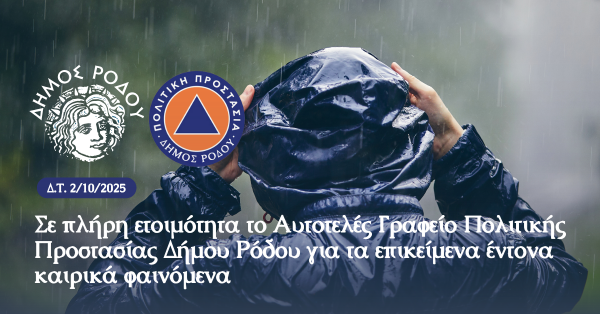Σε πλήρη ετοιμότητα το Αυτοτελές Γραφείο Πολιτικής Προστασίας Δήμου Ρόδου για τα επικείμενα έντονα καιρικά φαινόμενα