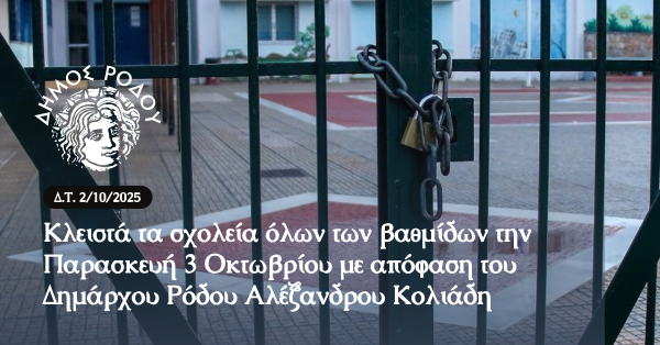 Κλειστά τα σχολεία όλων των βαθμίδων την Παρασκευή 3 Οκτωβρίου με απόφαση του Δημάρχου Ρόδου Αλέξανδρου Κολιάδη