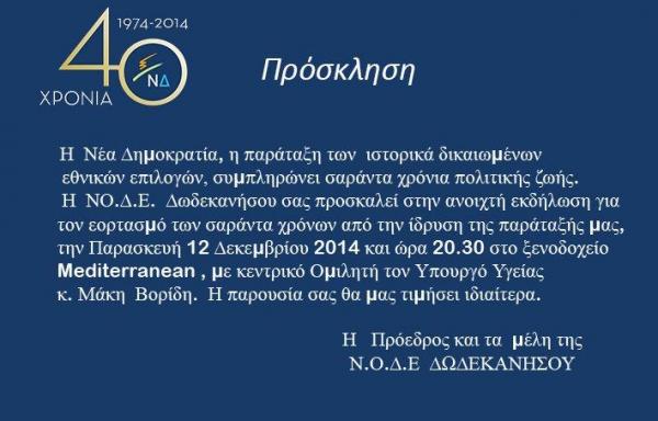 Τη παρασκευή 12 Δεκεμβρίου θα βρεθεί στη Ρόδο ο υπουργός Υγείας Μάκης Βορίδης. Θα παραβρεθεί σε εκδήλωση που θα πραγματοποιήσει η ΝΟΔΕ για τα σαράντα χρόνια απο την ίδρυση του ...