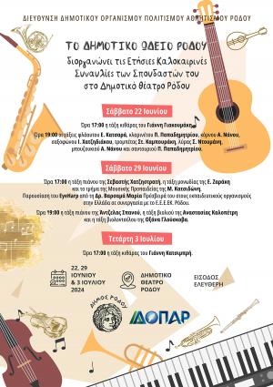 Το Δημοτικό Ωδείο Ρόδου διοργανώνει τις Ετήσιες Καλοκαιρινές Συναυλίες των Σπουδαστών του στο Δημοτικό Θέατρο Ρόδου για να γιορτάσει το κλείσιμο της Μουσικής...