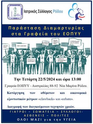 - Ο Ιατρικός Σύλλογος Ρόδου θα πραγματοποιήσει συμπαράσταση διαμαρτυρίας την Τετάρτη 22/5/2024 και ώρα 13:00 στα γραφεία του ΕΟΠΥΥ ...